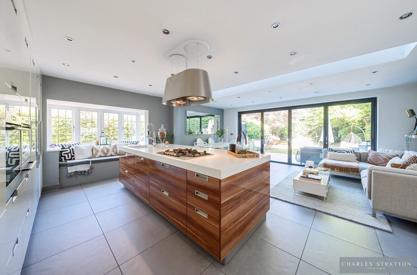 The front door opens to a Reception Hall with stairs ascending to the first-floor accommodation and doors opening to a Bay-Fronted Sitting Room, a small lobby with a Utility Cupboard and door opening to a Cloakroom W.C., and a large Kitchen/Family Room furnished with modern units and a large central island with contrasting drawers beneath. This room is a very bright open space with windows to both sides, one being a square bay with window seat beneath, a rooflight and Bi-Folding Doors which open the room to the patio and rear gardens.