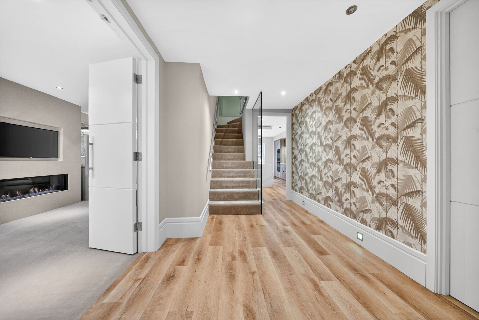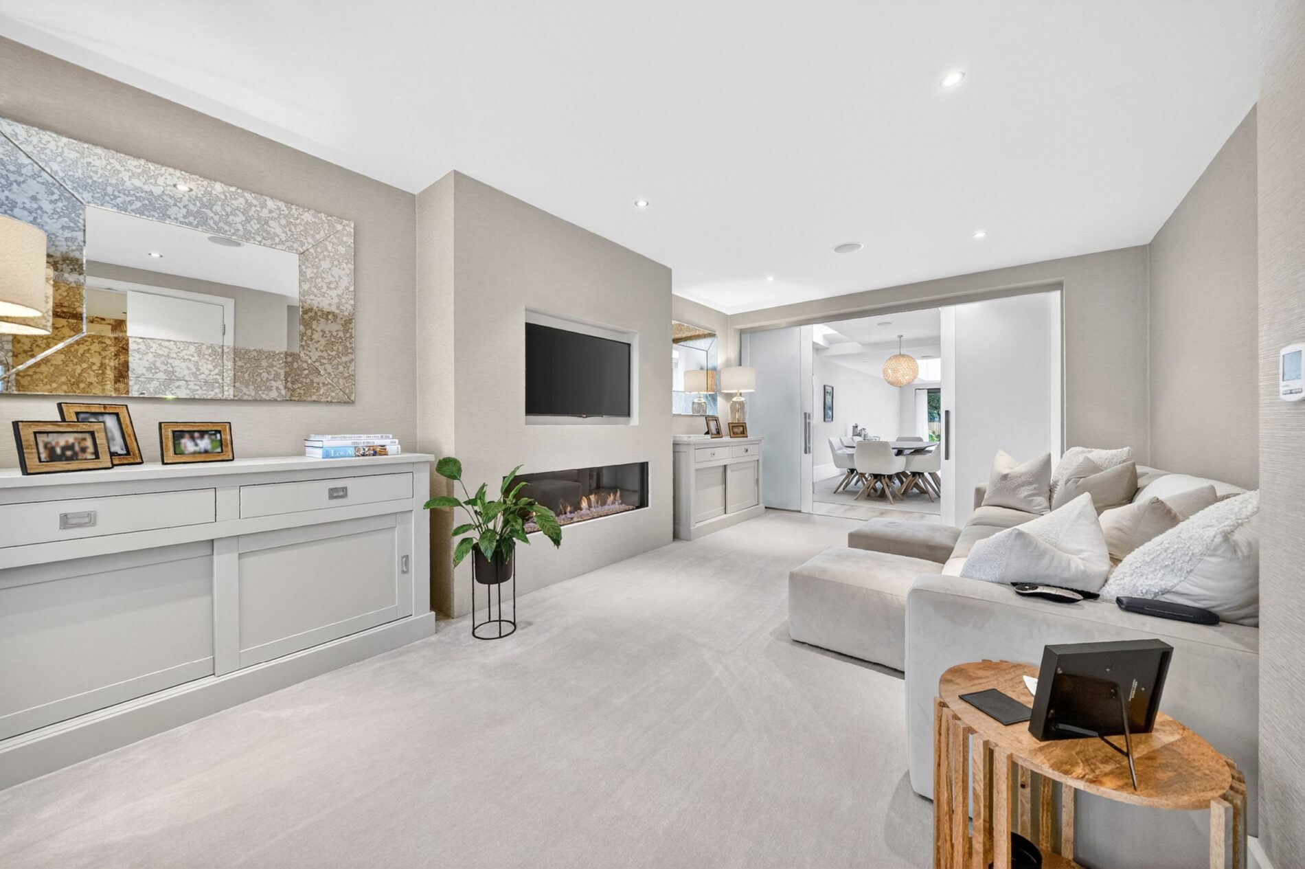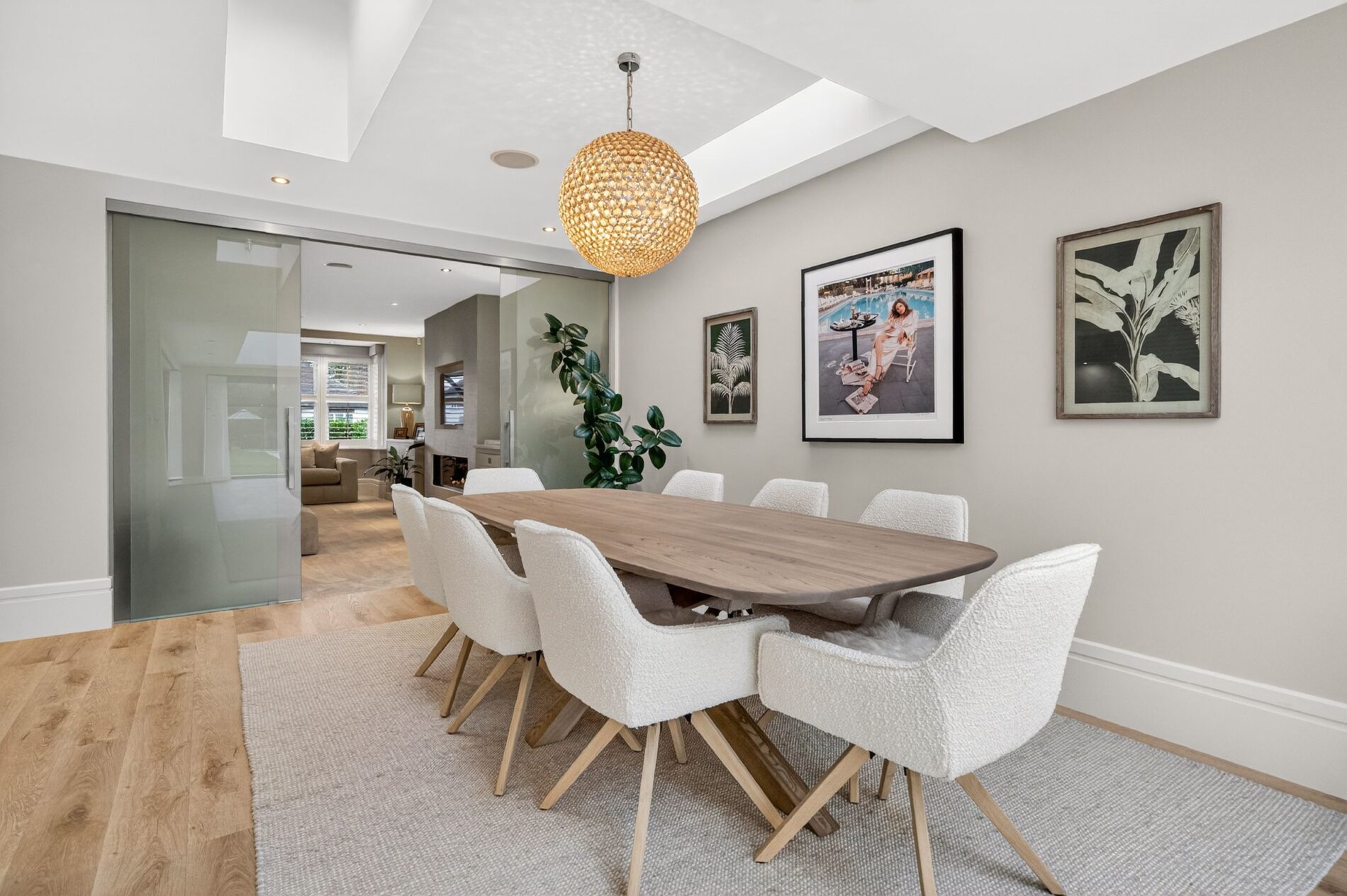 The front door opens to a spacious Reception Hall where doors lead to the ground floor accommodation and a staircase with a glazed balustrade ascends to the first floor. A pair of double doors open to the Sitting Room with a feature gas fireplace and a pair of opaque sliding doors which open to the Dining Room, Orangery, and Kitchen with separate Utility.
