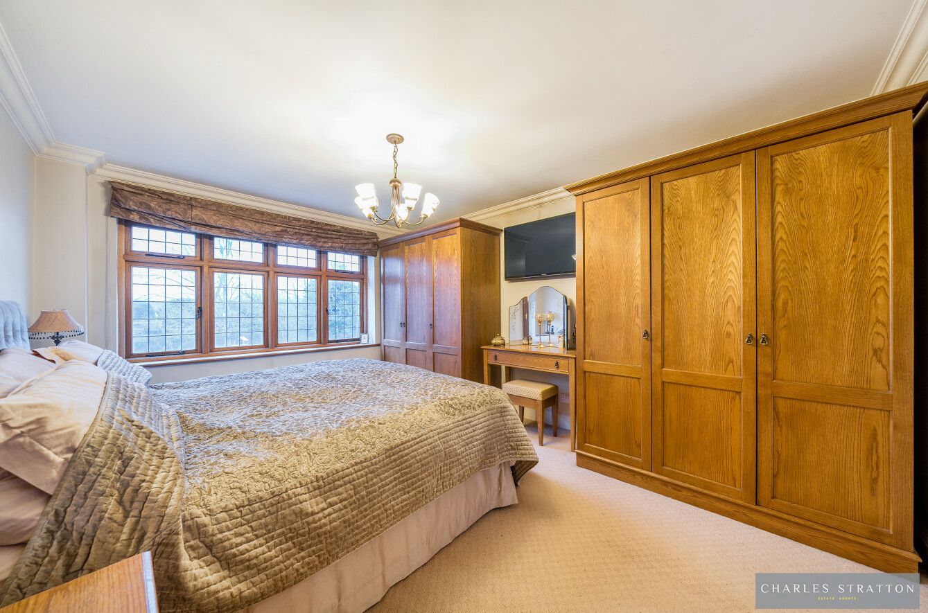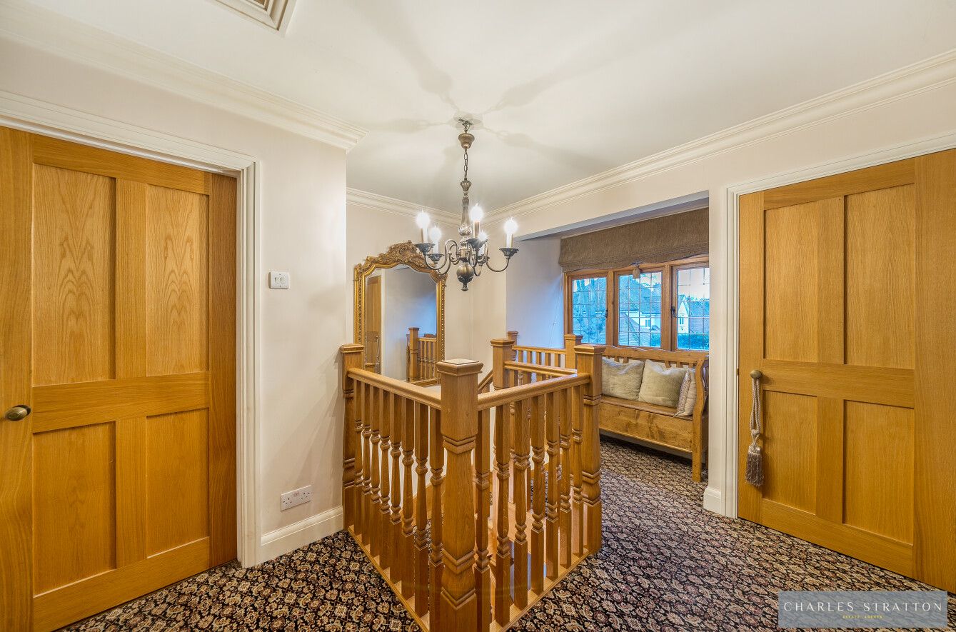 A returning staircase with an Oak Spindle Rail Balustrade and Newel Posts ascends to a large first floor landing with doors opening to three well-proportioned bedrooms, the Master with En-Suite, and a Four Piece Family Bathroom W.C.